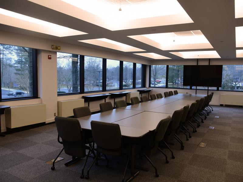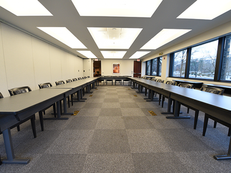 Windows line the perimeter of this spacious room, letting in ample amounts of natural light. This meeting room is ideal for round tables (36 attendees), classroom seating (30 guests), and theater style for briefing (64 guests).