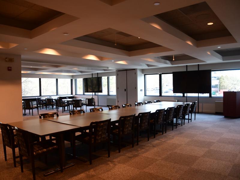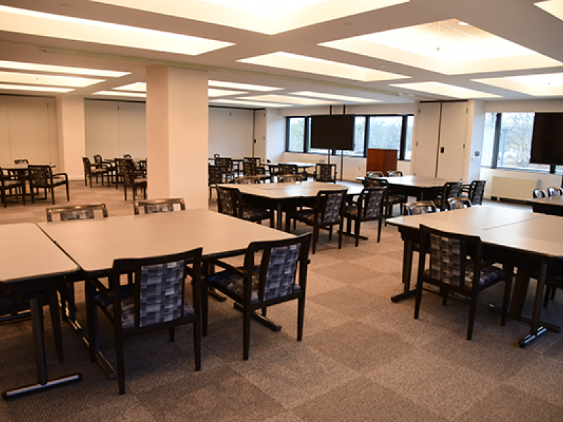 We combine two meeting rooms to support above average increases in meeting attendance; windows line the perimeter of this spacious room, letting in ample amounts of natural light. This meeting room is ideal for round tables (80 attendees), classroom seating (80 guests), and theater-style (120 guests).